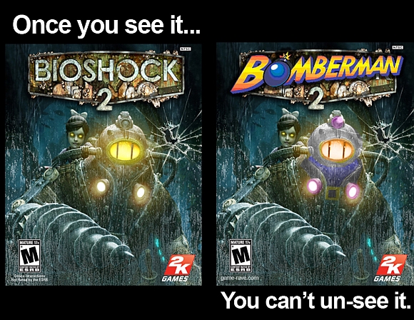 Dopotutto, se Bomberman ha fatto la sua apparizione sulla copertina di Bioshock 2 (come potete vedere nell’immagine seguente), anche il logo del nuovo titolo Bungie potrebbe essere comparso altrove, in maniera celata.