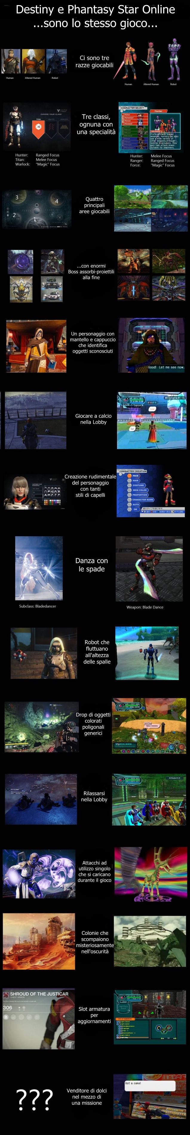 L’immagine che trovate allegata all’articolo, diffusa su Reddit, mostra alcune delle innegabili somiglianze fra i due giochi… analogie che non valgono più per Phantasy Star Online 2 che al momento ha quattro razze giocabili e quattro classi. Chissà, forse le aggiungeranno anche in Destiny. Questa immagine di confronto, inoltre, potrebbe suggerire a Bungie di inserire un commerciante di dolci nel mezzo delle missioni… a quanto pare i fan di Phantasy Star Online ne sentono la mancanza!