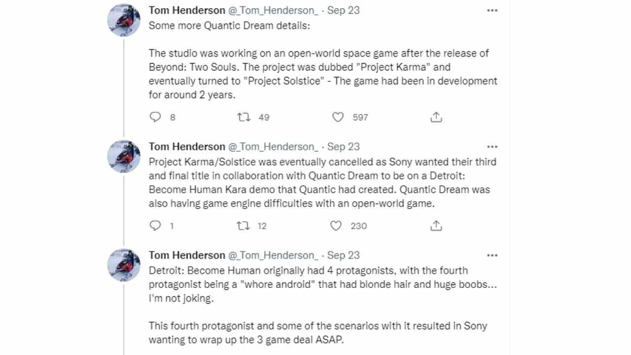 Più di qualche utente infatti ha scritto che l’idea di una protagonista prostituta androide poteva essere grandiosa ma probabilmente non nelle mani di David Cage. Ma oltre a riflettere se siamo finiti davanti a un caso di censura da parte del publisher per contenuti inappropriati a qualunque tipo di pubblico, c’è anche da notare che sempre Henderson riferisce anche di come Quantic Dream sia da un paio d’anni al lavoro su un progetto che prima si chiamava Project Karma, poi è diventato Project Solstice, e che adesso invece potrebbe tranquillamente essere il famoso nuovo gioco a mondo aperto inserito nell’universo di Star Wars. Anche se sembra che i ldeveloper non abbia le risorse tecniche per gestire un mondo aperto.