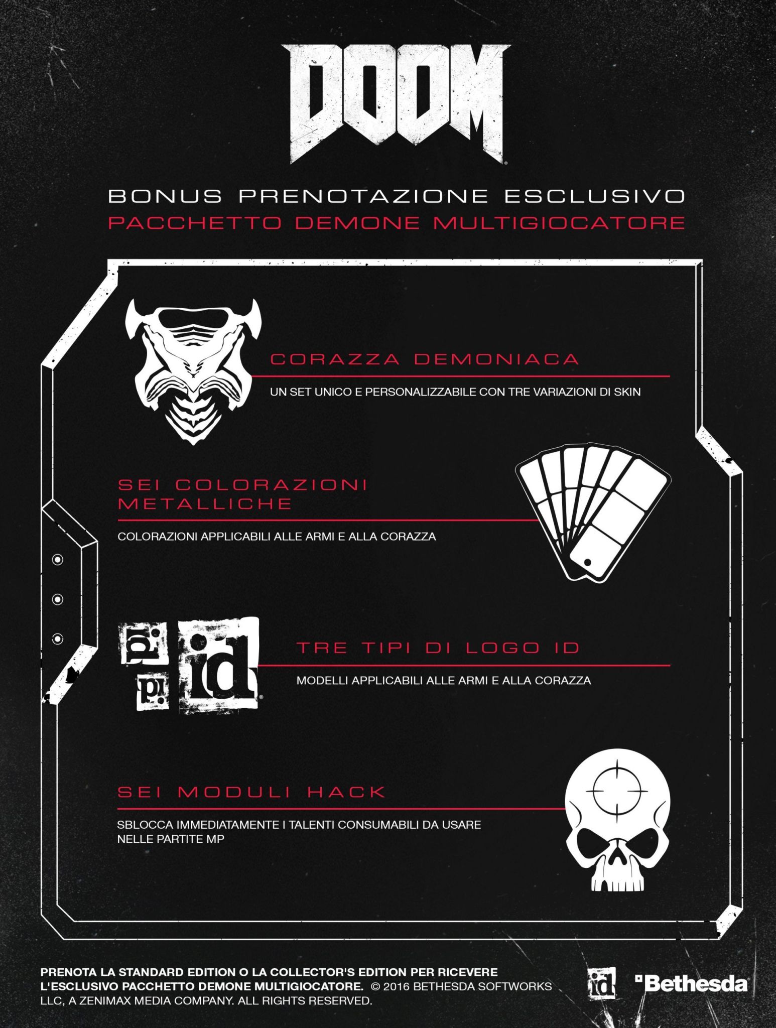 Questa Collector’s Edition di DOOM è disponibile per la prenotazione presso i rivenditori aderenti all’iniziativa al prezzo di 129,99 €. I giocatori che prenotano la Collector’s Edition o l’edizione standard di DOOM riceveranno il pacchetto Demone multigiocatore, contenente un set di armatura demoniaca unico con tre skin, sei colori di vernice metallizzata e tre elementi grafici con il logo id applicabili ad armi e armature, più un set di sei moduli hack, ovvero oggetti di gioco usabili una sola volta e molto utili nelle partite multigiocatore.