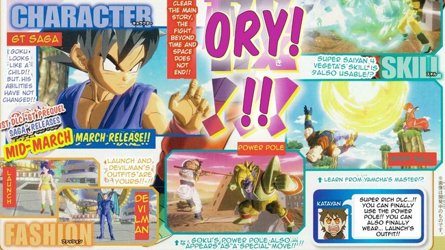 Tramite la rivista giapponese Weekly Shonen Jump sono stati rivelati i contenuti del primo DLC di Dragon Ball: Xenoverse, che sarà disponibile per il download a marzo in Giappone. Il primo contenuto aggiuntivo del picchiaduro permetterà di accedere alla “GT Prequel Saga”, ovvero le avventure narrate in Dragon Ball GT. Nel DLC saranno inclusi anche gli outfit di Launch (Laura in italiano) e Devilman (Devil nella versione italiana dell’anime) e inoltre, saranno disponibili due nuovi attacchi per i personaggi personalizzati: Final Shine Attack e Spirit Ball. Infine è stata annunciata la presenza anche di una nuova arma, ovvero il Power Pole (il bastone magico allungabile di Goku).
