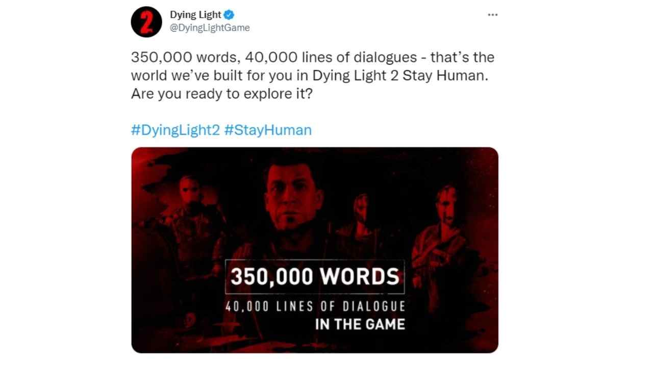 Sul profilo Twitter dedicato a Dying Light, che adesso ospita gli aggiornamenti del secondo capitolo della saga zombie, tutta l’attenzione si è concentrata sul post più recente in cui si legge: “350.000 parole, 40.000 righe di dialogo, questo è il mondo che abbiamo costruito per voi in Dying Light 2 Stay Human. Siete pronti ad esplorarlo?“.