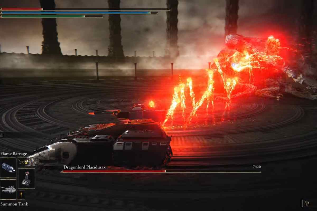 Un altro prodotto di successo di Garden of Eyes, che tra l’altro si diverte a modificare i giochi FromSoftware da un bel po’, è quello che trasforma le boss fight in incontri di lotta da guardare seduti e rilassati mentre altri fanno il lavoro sporco. Magari non è il modo in cui FromSoftware immaginava dovessimo sperimentare Elden Ring ma di certo è un modo per non vedere il proprio livello di frustrazione raggiungere picchi preoccupanti. E sulla stessa riga si muove la nuova mod esplosiva con tank e jet da guerra.
