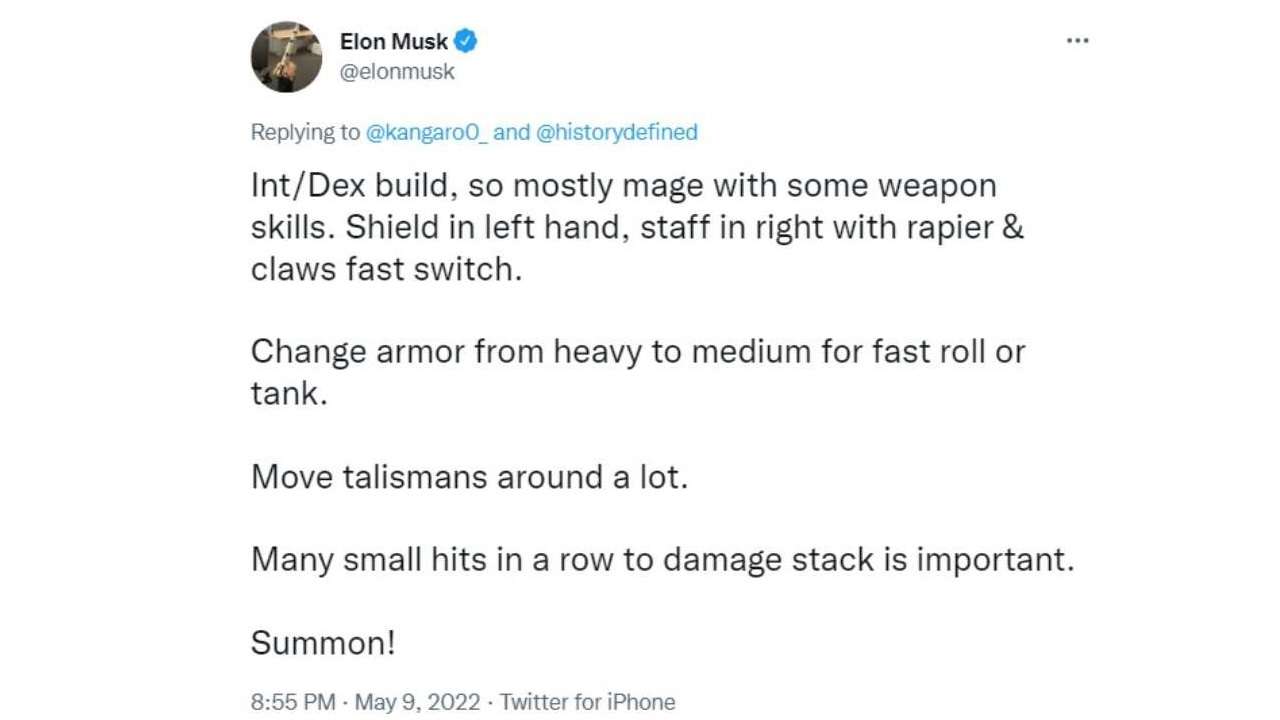 Per capire perché Elon Musk ha voluto condividere con il social il modo in cui gioca occorre fare un piccolo passo indietro. Sull’account HistoryDefined è stata pubblicata una fotografia che rappresenta un mosaico risalente all’VIII secolo. Mauk ha risposto con tre parole: “Elden Ring Vibes”. Al che un altro utente, KangaroO, ha chiesto molto gentilmente e utilizzando addirittura la parola “sapienza” consigli riguardo soprattutto la classe del Mago. Questo è il messaggio di Elon Musk: “Build Int/Dex, quindi praticamente un mago con alcune abilità legate alle armi. Scudo nella mano sinistra, bastone nella destra con uno stocco e gli artigli per un cambio rapido. Cambia l’armatura da pesante a media per rotolare rapidamente e affrontare di petto i nemici. Sposta parecchio i talismani. È importante colpire con una serie di piccoli danni. Evoca!”
