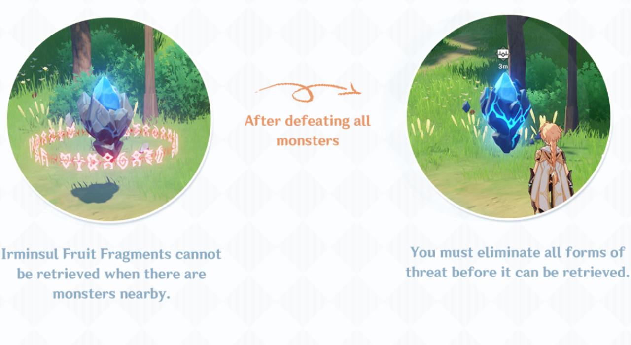 Ogni 2 giorni, MiHoYo evidenzia sulla mappa diversi luoghi di interesse da esplorare, dove sono presenti dei nemici da sconfiggere. Si tratta di nemici potenziati da dei particolari cristalli, i quali vanno distrutti per poter affrontare la zona senza doversi scontrare con entità pericolose. Una volta liberata la zona si può accedere ad un secondo cristallo, che conterrà le ricompense: Primogems, materiali exp ma anche la valuta esclusiva dell’evento, Fractured Fruit Data, spendibile nel negozio dedicato per ulteriori Primogems, materiali per talenti, ascensione o, addirittura, per poter ricevere il personaggio di Diona senza dover ricorrere al gacha.