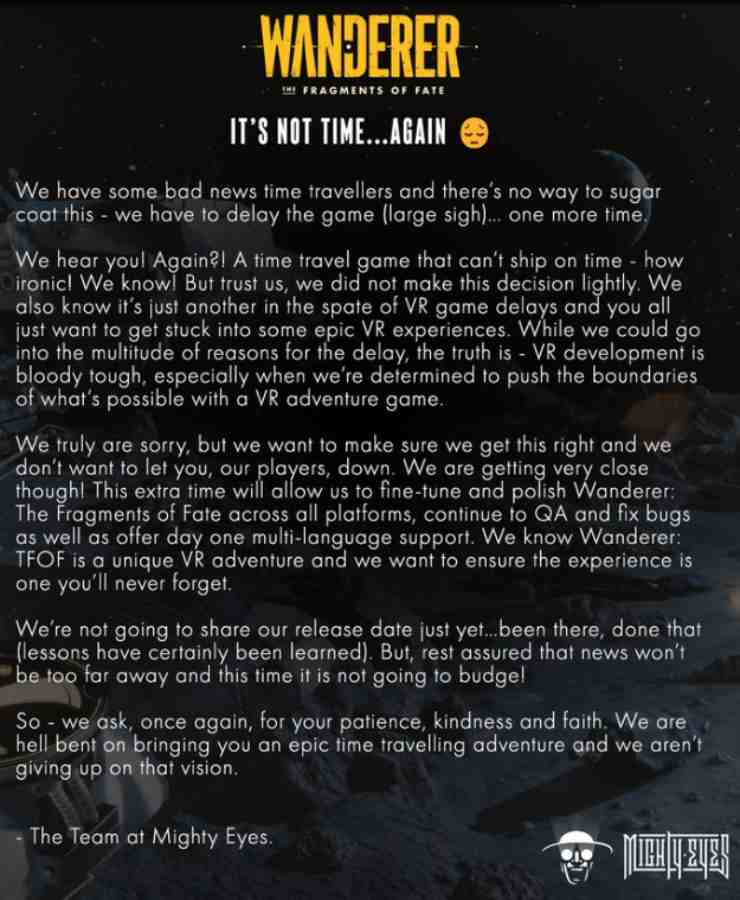 Wanderer: The Fragments of Fate è un gioco in VR tra i più interessanti di sempre, ma purtroppo il suo lancio non è affatto vicino. Come annunciato dagli sviluppatori di Mighty Eyes, infatti, il prodotto non verrà più lanciato a ottobre 2024, cioè questo mese, come preventivato dopo l’ultimo rinvio. Al momento non ci sono date ufficiali, ma gli sviluppatori fanno sapere che servirà tempo.