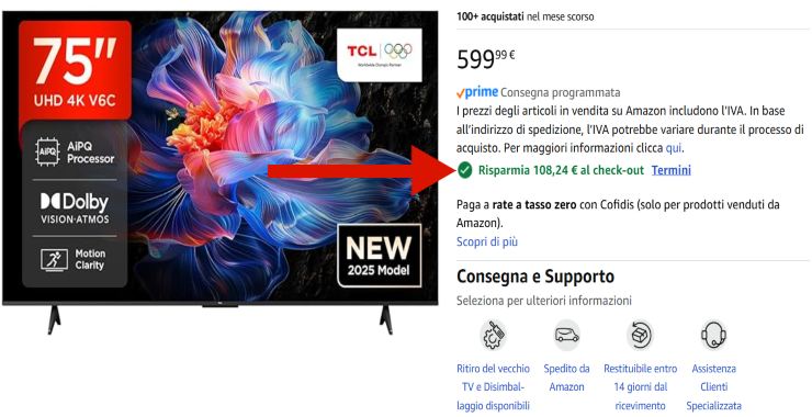 Tramite il nostro link vedrete che si attiverà un coupon: mettete questa TV nel carrello (non acquista ora), procedere all’acquisto tramite carrello e voilà: vi costerà soltanto 491 euro dopo il buono sconto da 108 euro che si attiverà automaticamente. Ovviamente fino ad esaurimento scorte!