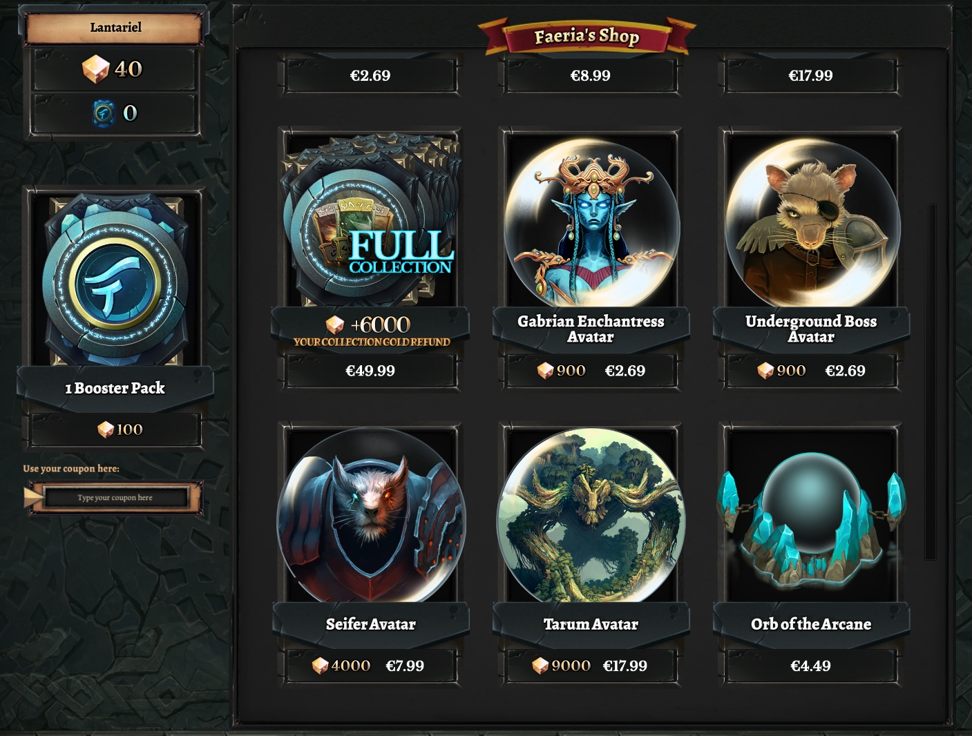 Faeria - ShopPassando ora al reparto tecnico Faeria, come molti altri TCG, al momento non si distingue sicuramente per la grafica o il sonoro. Per quanto infatti il gioco sia completamente esente da bug o artefatti grafici e le musiche risultino nella maggior parte dei casi azzeccate, si potevano ottenere sicuramente dei risultati migliori.