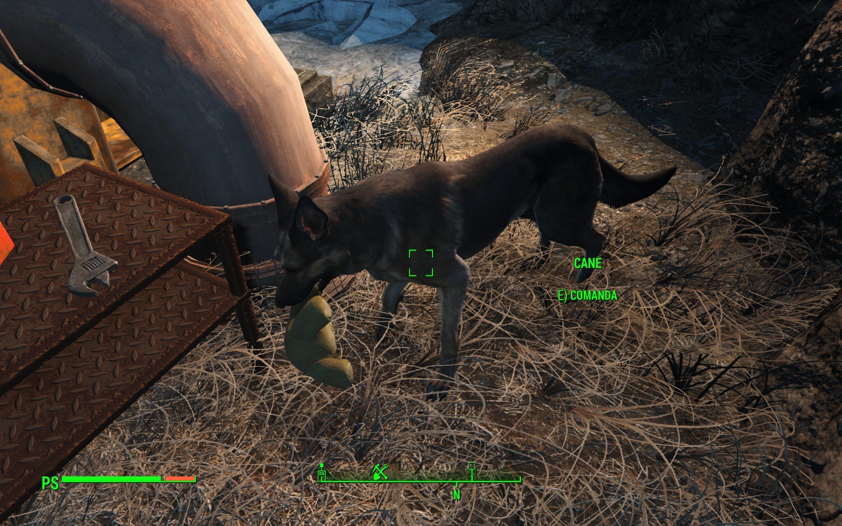 La nostra caccia ci porterà di lì a poco a fare la nostra seconda conoscenza: il cane Dogmeat, che non tarderà infatti a farsi vedere e comincerà a seguirci in ogni nostro passo difendendoci da predoni infastiditi, facendosi carico del nostro fardello (ogni aiutante potrà riempirsi le tasche di ognuno degli oggetti che non riusciremo a caricare) e scoprendo per noi, di tanto in tanto, qualche “tesoro nascosto”. Osservarlo in azione sarà poi una delle cose più belle: la cura dei dettagli e la riproduzione dei movimenti è finalmente quella di un vero cane, dalle orecchie alla coda. Impareremo ad amarlo e ci verrà naturale proteggerlo quando qualcuno proverà a fargli del male…