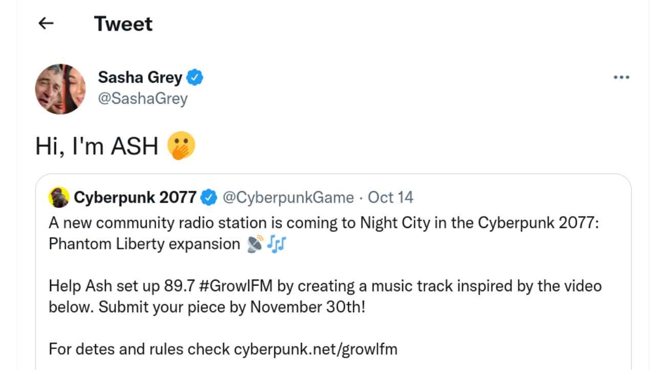 In quella occasione la situazione si è poi risolta ma il caso rimane. Per quello che riguarda invece Sasha Grey si tratta di una situazione diametralmente opposta. Il team di sviluppo polacco di Cyberpunk 2077 ha infatti deciso di inserirla in Phantom Liberty, al momento unica espansione prevista per Cyberpunk. L’annuncio è stato dato in realtà dalla stessa attrice attraverso Twitter, riprendendo un messaggio dall’account ufficiale del videogioco in cui si reclamizza un concorso in cui viene chiesto ai creativi musicali di proporre la propria traccia da inserire all’interno di una nuova stazione radio che si potrà ascoltare all’interno del gioco.