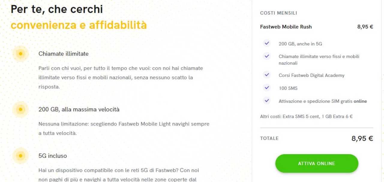 Ricapitolando, l’offerta prevede minuti illimitati verso fissi e mobile nazionali, 100 SMS, 200 GIGA in 5G, 8 giga di traffico a roaming zero (quindi per l’estero), e i vari servizi segreteria telefonica, avviso di chiamata, Ti ho chiamato, verifica credito residuo. Fastweb garantisce tali condizioni economiche per almeno 12 mesi dall’attivazione, mentre, in merito ai costi, abbiamo detto gli 8.95 euro al mese, ma anche 10 euro per l’attivazione che diventano zero se la si effettua online (gratis la spedizione della sim). Qualora si dovesse superare il numero di sms, il costo per la spedizione sarà di 0.05 euro mentre, se si dovessero superare i 200 gigabyte a disposizione, si spenderanno 6 euro per ogni giga.
