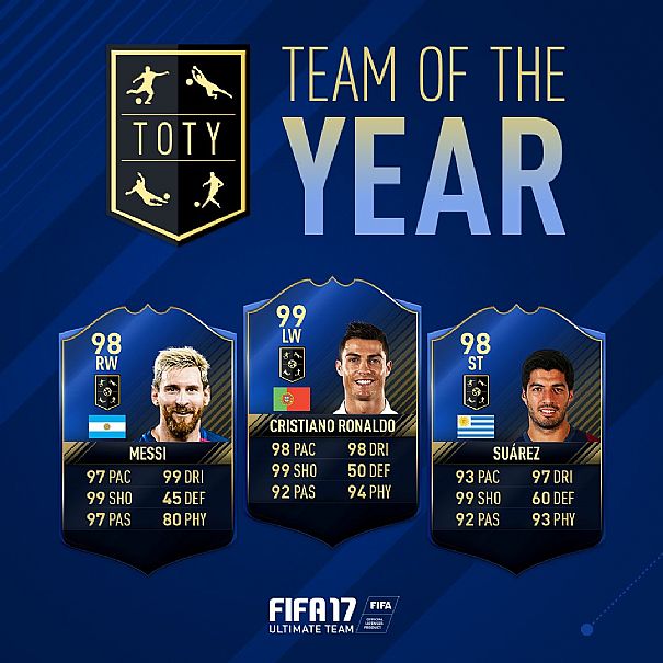 Fino alle 19 di oggi saranno disponibili a tutti i giocatori di FIFA 17 Ultimate Team i tre attaccanti: Luis Suárez (98), Cristiano Ronaldo (99) e Lionel Messi (98).