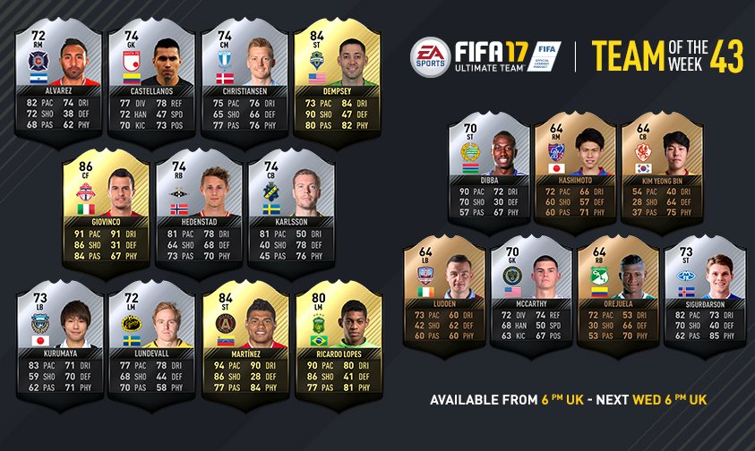 EA Sports ha divulgato la Squadra della Settimana #43 di FIFA 17 Ultimate Team, che include alcuni volti nomi della Serie A come Sebastian Giovinco, ora al Toronto FC.
