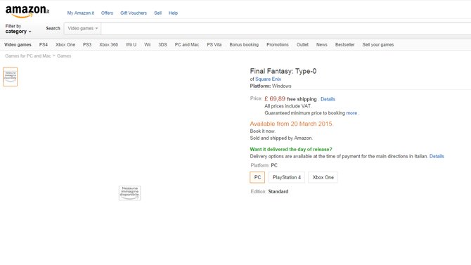 Un utente di NeoGaf si è accorto che nella pagina di Amazon.it dedicata ai preordini di Final Fantasy: Type-0 HD è comparsa la versione PC, oltre a quelle PS4 e Xbox One. Per il momento non c’è nessuna immagine di tale versione, a differenza di quelle console già in bella mostra; tuttavia pare che la data d’uscita sia la stessa su PC, PS4 e Xbox One, ovvero il 20 marzo 2015.