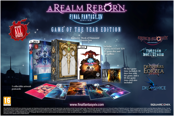 Square Enix ha annunciato la “Game of the Year” Edition per l’MMORPG Final Fantasy XIV: A Realm Reborn. Questa edizione sarà disponibile su PC a partire dal 14 novembre 2014 e includerà la confezione speciale “Book of Diamonds”, cinque esclusive cartoline collezionabili, un abbonamento di 30 giorni di prova più altri 60 (in totale 90 giorni gratuiti di gioco), oltre a tutti i DLC pubblicati fino a questo momento: “A Realm Awoken”, “Through the Maelstrom”, “Defenders of Eorzea” e “Dreams of Ice” (che sarà disponibile nel corso del mese di ottobre). Inoltre, il gioco sarà arricchito con nuovissimi contenuti, tra cui nuove modalità PVP, nuove razze e classi disponibili, un nuovo sistema di crafting e molto altro.