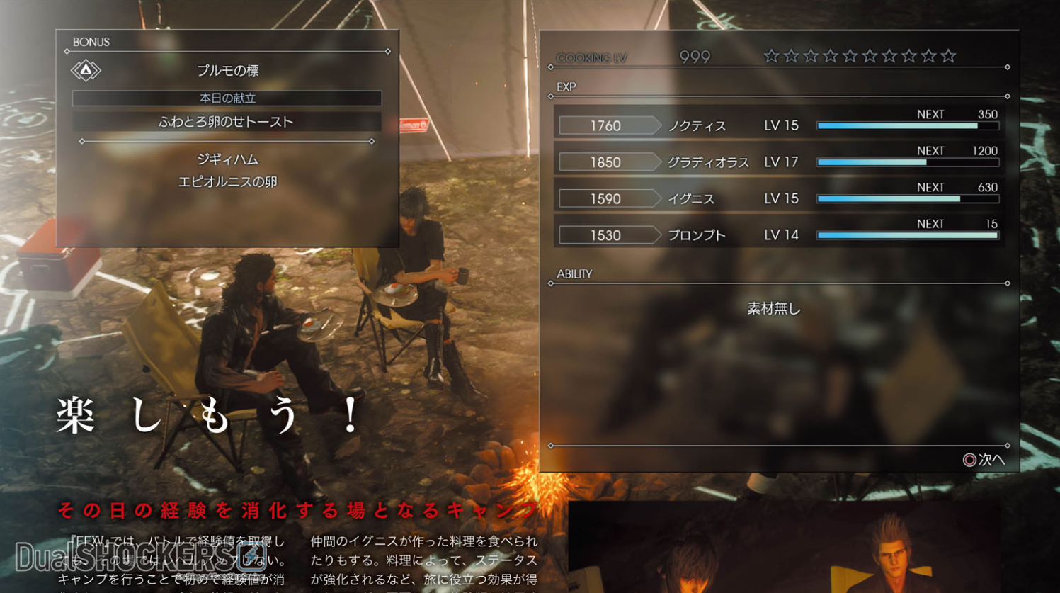 Gli screenshot mostrano anche alcuni dettagli sull’abilità di cucina, con la possibilità di creare ricette come il Fuwatoro Egg (Uovo Fuwatoro) su una fetta di pane tostata, durante un sosta in un accampamento notturno. Il cibo assicurerà diversi bonus, mentre accamparsi consentirà al personaggio di accumulare l’esperienza per poi utilizzarla e salire di livello.