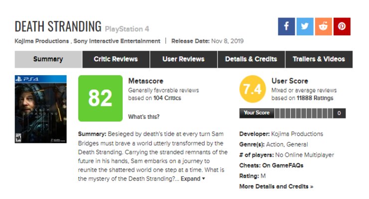 Death Stranding ha un punteggio Metacritic di 82 per quanto riguarda i voti della critica e un 7.4 come voto dei giocatori. Impossibile fare previsioni sicure, ma dopo quello che ha detto Kojima in merito ai feedback ricevuti, se dovessimo scommettere un euro, diremmo che sono in arrivo voti più alti in entrambe le voci. Ricordiamo che Death Stranding 2 uscirà il prossimo 26 giugno 2026.