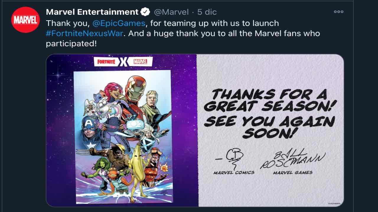 Tuttavia non si tratta di un’indiscrezione fornita da qualche dataminer o leaker, ma un post su Twitter niente di meno che dalla Marvel in persona. Sì, esattamente un tweet nel quale ringrazia direttamente la Epic Games per la splendida opportunità e collaborazione durante la Stagione 4. La conclusione del post termina con un secco “Ci rivedremo presto”, il che fa ben sperare ad un gran ritorno in pompa magna del mondo dei supereroi ma anche dei supercattivi. Purtroppo non si sa niente di più, non resta che aspettare in attesa di qualche altro indizio o magari dei qualche trailer inedito che sveli qualche cosa in più.