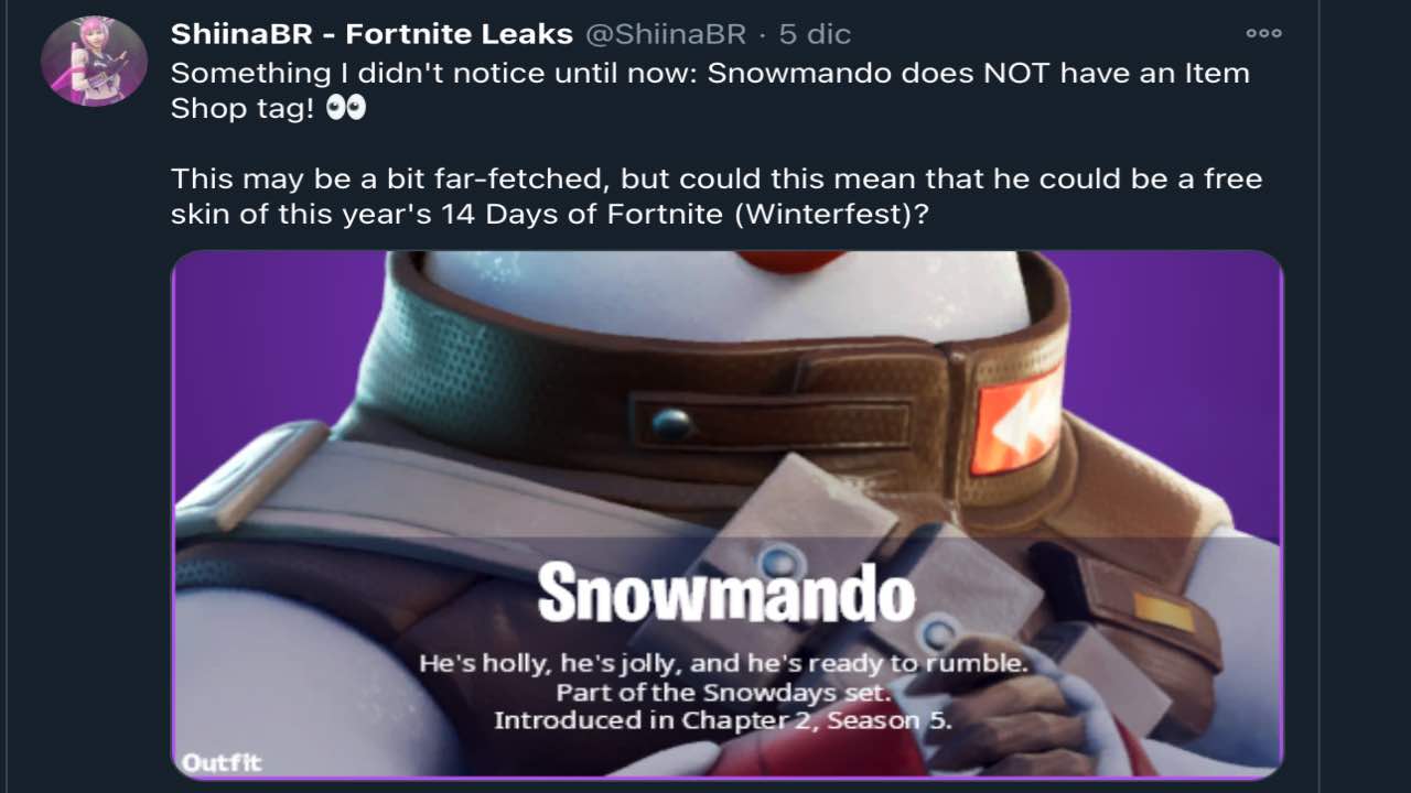 This may be a bit far-fetched, but could this mean that he could be a free skin of this year's 14 Days of Fortnite (Winterfest)? pic.twitter.com/NAvxhW6Tg9