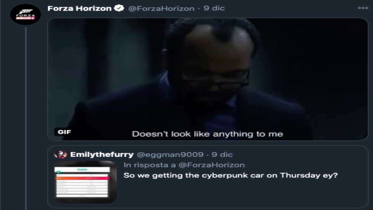 Si può quindi sperare nella pubblicazione di auto direttamente da Night City, che però possono essere utilizzate solo all’interno di Forza Horizon 4. Alcuni appassionati addirittura pensano che dietro l’annuncio di Playground Games vi sia un significato ben diverso. Infatti si crede che prima di vedere in vigore il nuovo reveal del prossimo Horizon, deve passare ancora molto tempo.
