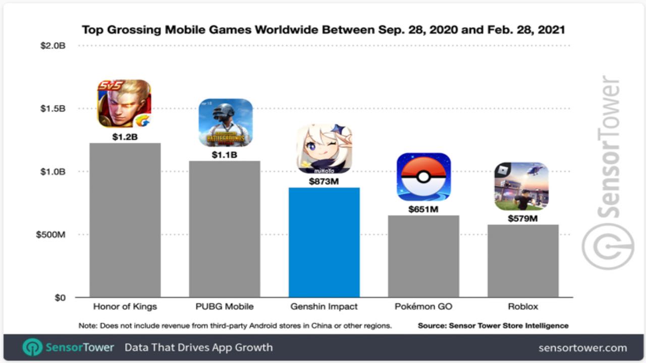 Nonostante ciò, pare che questo successo non tenda a diminuire. Basandosi sui dati di SensorTower, GI è stato in grado di generare circa 874 milioni di dollari di entrate. In questo mood è riuscito ad aggiudicarsi il terzo posto della classifica dei giochi mobili più remunerativi.