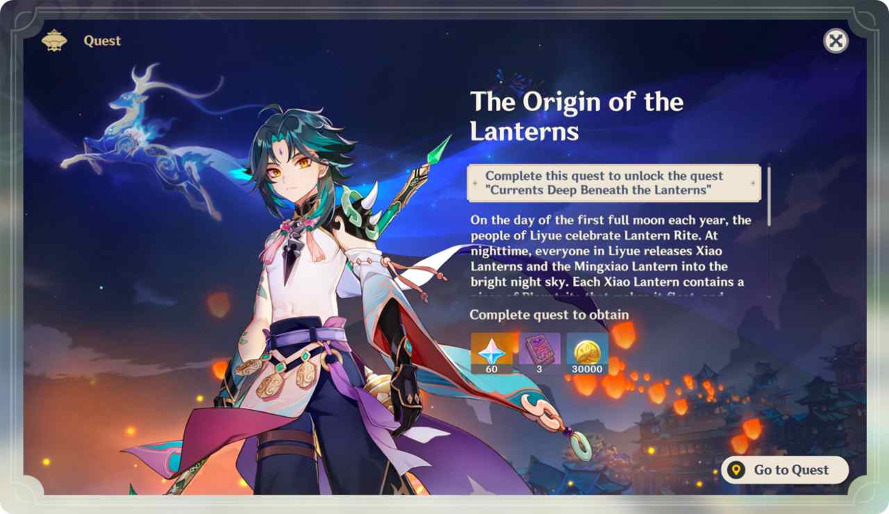 Completando, inoltre, “Origin of the Lanterns” darà accesso a “Lantern Tales”, che consiste in una serie di richieste da parte dei cittadini di Liyue Harbor da soddisfare: in palio, altre Primogems, Mora e una versione-evento di punti esperienza, Festive Fever, che servirà a far progredire il giocatore ulteriormente in “Lantern Tales” e in “Theater Mechanicus”. Si può tenere traccia di “Lantern Tales” tramite il menu a ruota o premendo F5.