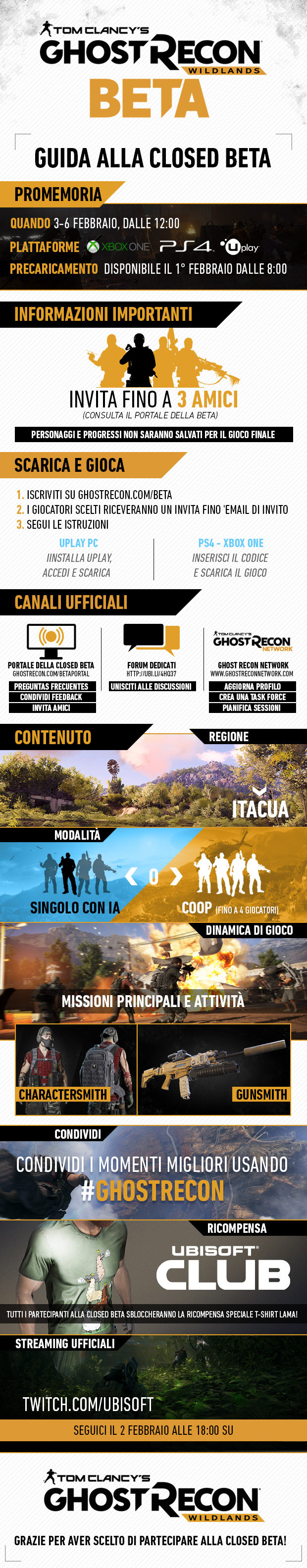 Altre informazioni potete trovarle nell’infografica in chiusura d’articolo. Ghost Recon Wildlands arriverà su PlayStation 4, Xbox One e PC (Uplay) il 7 marzo 2017.