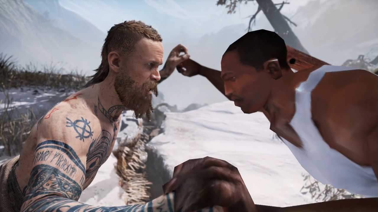 Come infatti Kratos maneggia la sua ascia dall’altisonante nome Leviatano, CJ è armato di una mazza da baseball incantata e come Kratos in God of War è accompagnato dal figlio Atreus anche Carl Johnson direttamente da GTA è accompagnato da una sua versione di Atreus che però non vogliamo assolutamente spoilerarvi. Vi diciamo soltanto che non si tratta di un essere umano.