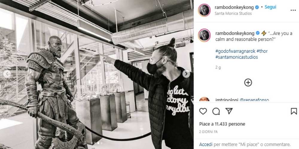 Come si vede in basso, sull’account ufficiale del Playstation Studio Santa Monica, sono state condivise delle immagini di un famoso attore che si è recato allo studio. Parliamo di Ryan Hurst, famoso per aver avuto il ruolo di Opie in Sons of Anarchy. Sarà lui il Thor di God of War Ragnarok, che ha causato un enorme dibattito tra i videogiocatori. Probabilmente andato per registrare qualche dialogo per il gioco, Hurst ha pubblicato delle immagini mentre “sfida” la statua di Kratos presente nello studio di Santa Monica, di fatti mettendo in scena quella che presto potrà essere una grande battaglia. Di seguito l’immagine.