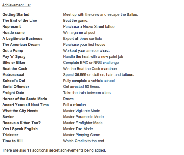 Come anticipato ieri dalla scoperta della lista di achievement, Xbox 360 riceverà a breve una versione esteticamente migliorata di Grand Theft Auto: San Andreas. Le uniche informazioni diffuse in questo momento sono la risoluzione a 720p e il supporto degli achievement, comprendenti nuovi obiettivi (li trovate qui sotto). Rockstar ha inoltre annunciato che questa versione “Games on Demand” non supporterà i salvataggi di quella uscita nella collana “Xbox Originals”. Nel momento in cui scriviamo queste righe, non sono stati forniti ancora dettagli circa un’eventuale versione per PS3. Nel caso fossero diffusi successivamente, non mancheremo di avvisarvi. Grand Theft Auto: San Andreas uscirà il 26 ottobre, giusto in tempo per festeggiare il decimo anniversario del gioco.