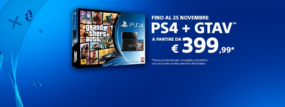 Tramite il PlayStation Blog, Sony Computer Entertainment ha annunciato ufficialmente la disponibilità del bundle che contiene PlayStation 4 e una copia di Grand Theft Auto V. Ma c’è di più: a partire da domani (giorno d’uscita del gioco) fino a martedì 25 novembre, il bundle sarà disponibile (nei negozi che aderiranno all’offerta) al prezzo di 399.99 Euro.