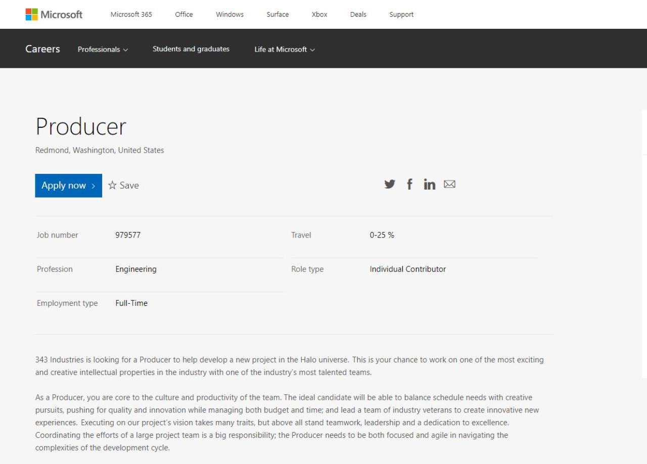 L’annuncio in questione è freschissimo e risulta tra i post più sponsorizzati della pagina web dedicata. Il ruolo di producer, come il post stesso specifica, è una figura direttrice, di grande responsabilità, che servirebbe a coordinare un nuovo progetto del vasto universo narrativo della vecchia IP di Bungie.