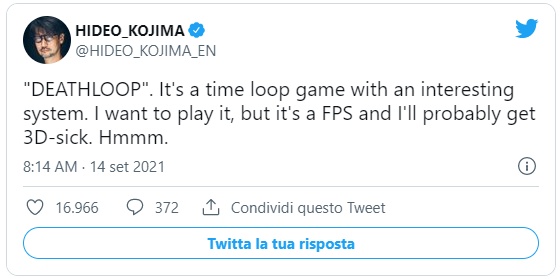 In effetti, grazie al suo post, ora sappiamo che Kojima soffre di motion-sickness! Il motion-sickness non è altro che una forte nausea, accompagnata anche da capogiri e mal di testa, dovuta al tipo di gioco che si sta giocando. Spesso i generi di giochi che possono portare questo disturbo sono gli Fps e i giochi in realtà virtuale. Infatti Deathloop è un Fps, e anche se il famoso produttore ha molta voglia di provarlo e di giocarci ma purtroppo ha paura di sentirsi male.
