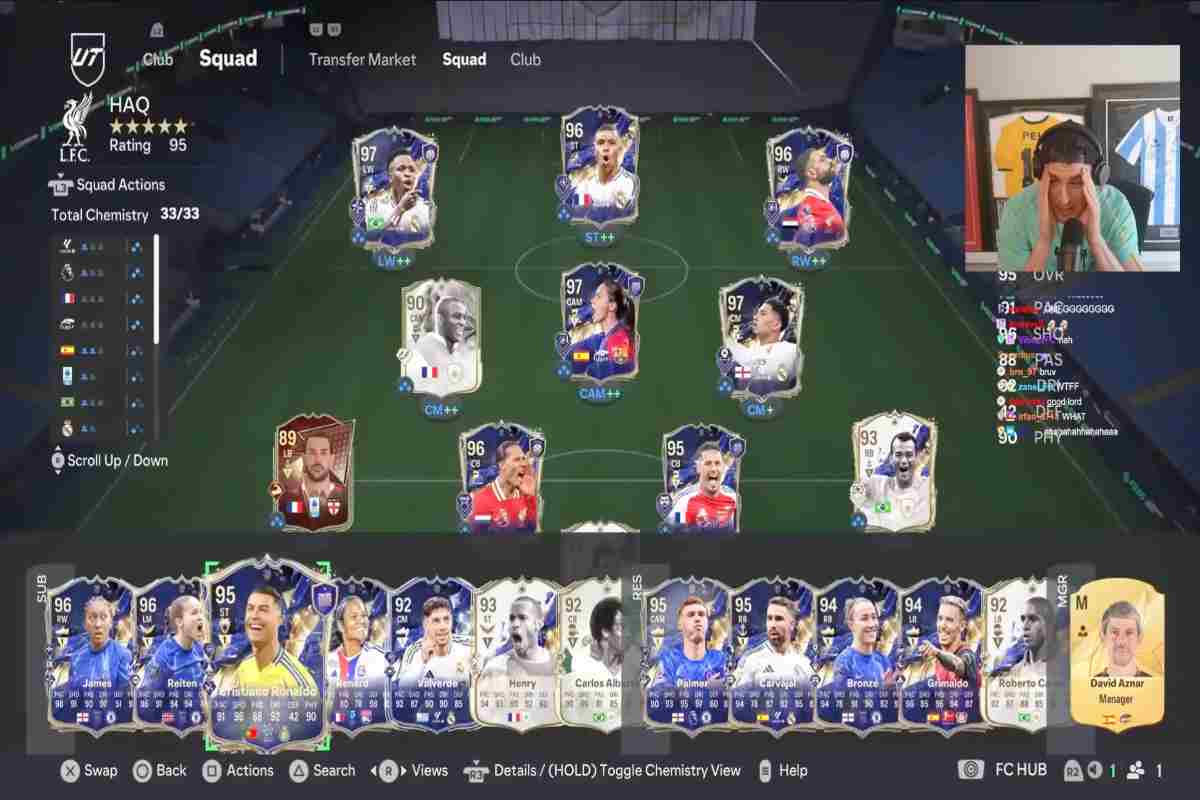 Come si vede nel video il giocatore in questione non ha soltanto una rosa da far paura, ma anche tantissimi giocatori che sono stati trovati nei pacchetti, come conferma il triangolino con il numero “1” sulla carta che certifica il fatto che sia il primo possessore. Il giocatore in questione ha praticamente tutte le carte TOTY tranne quelle di Mbappé, van Dijk e Salah, che ha acquistato sul mercato. Tra le icone ci sono Henry, Roberto Carlos e Carlos Alberto. “Ecco dov’è finita la mia fortuna”, hanno scritto alcuni utenti sotto il video frustrati dalla sfortuna.