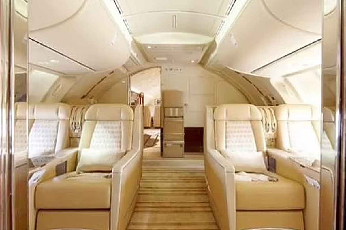 Dentro di certo non si è badato a spese. L’aereo infatti è composto come una villa con molti salottini dalle rifiniture eleganti in puro stile francese e con sale conferenze con inserti in mogano e lusso in ogni angolo. Anche se buona parte della struttura interna è stata sostituita da queste zone, c’è comunque posto per una novantina di ospiti, tutti accomodati su poltrone Business Class Superior.