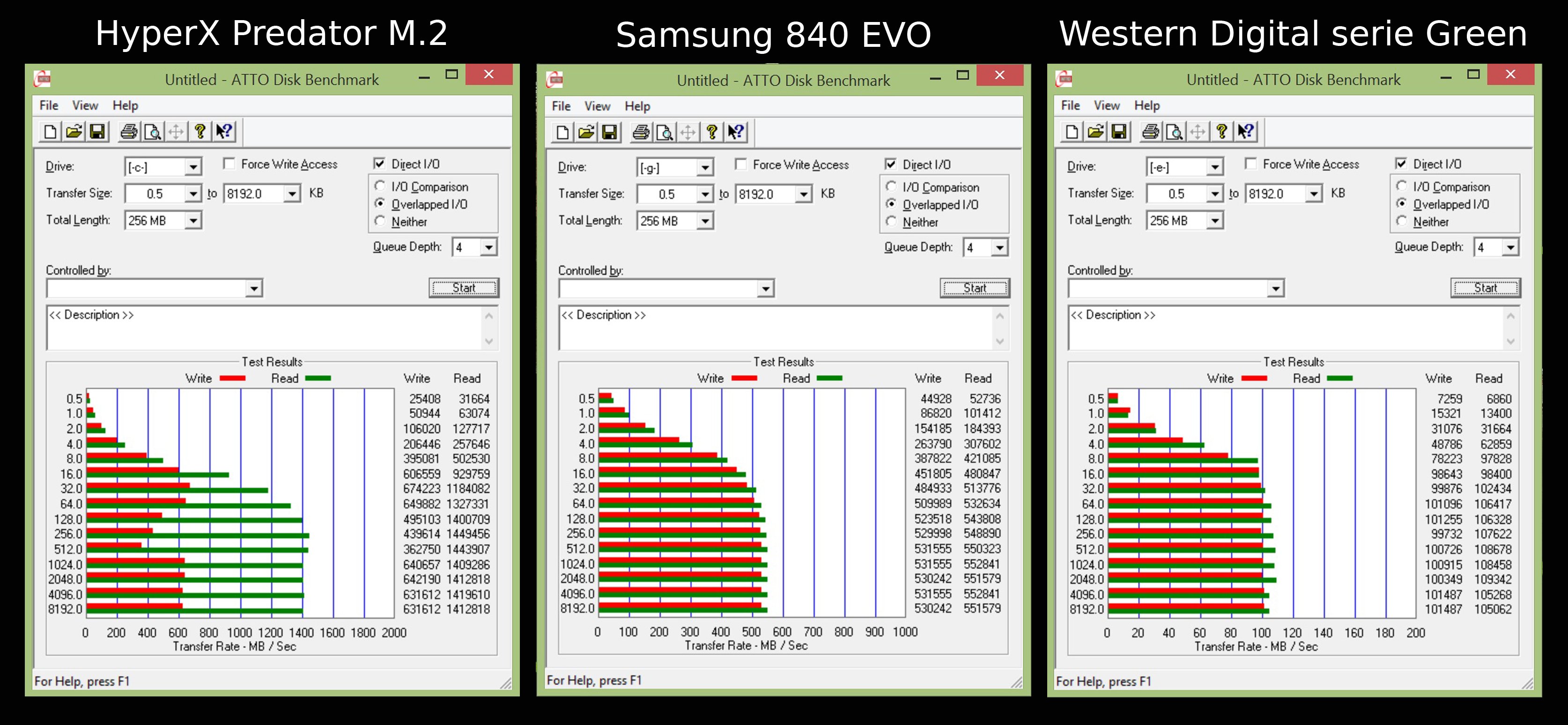 Per renderci effetivamente conto di che cosa fosse in grado di fare l’M.2 abbiamo ricreato un ambiente di utilizzo realistico, installando direttamente su questa unità il sistema operativo Windows 8.1, completo di driver, giochi, antivirus e tutte le applicazioni che quotidianamente si trovano nei nostri desktop, prima di lanciare qualunque tipo di test. Come termini di confronto abbiamo utilizzato un SSD Samsung 840 EVO da 256GB e un HDD meccanico Western Digital serie Green da 1TB di capacità e 7200RPM. Il software utilizzato per i test è ATTO Disk Benchmark 2.47, un freeware che mette alla prova le capacità di lettura e scrittura con pacchetti di dati di dimensioni variabili.
