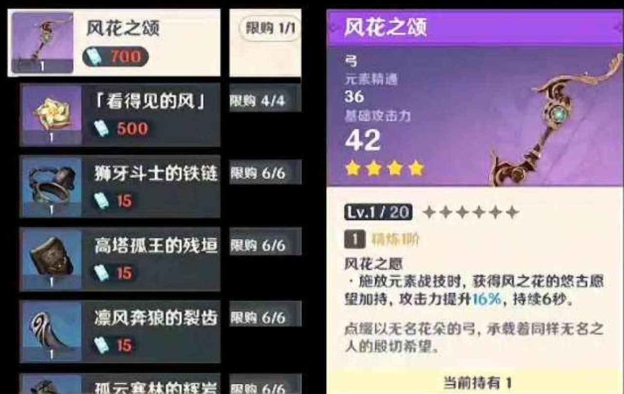L’arco a 4 stelle, per il momento chiamato Windblume Ode, possiede come statistica principale la elemental mastery e aumenta i danni dopo aver utilizzato la elemental skill, ovvero la E, sulla versione PC. L’arco sembra, dalle premesse, un ottimo arco per gli utilizzatori di Ganyu, Fischl o addirittura chi si addentra nel tortuoso percorso di utilizzare Amber. Chi ha avuto la fortuna di trovare Tartaglia, potrebbe fare ottimo uso di questo arco, oltre tutto.