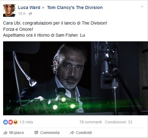 Congratulandosi con Ubisoft per l’ottimo lancio di The Division, Luca Ward ha anche citato il personaggio da lui doppiato, Sam Fisher.