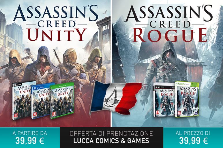 I fortunati partecipanti al Lucca Comics and Games 2014 potranno avvalersi di un’offerta imperdibile per acquistare Assassin’s Creed Unity e Assassin’s Creed Rogue. Presso Villa Bottini (raduno di tutti i fan della saga) sarà allestito l’Assassin’s Creed Shop, dove tutti i presenti potranno usufruire delle seguenti occasioni: