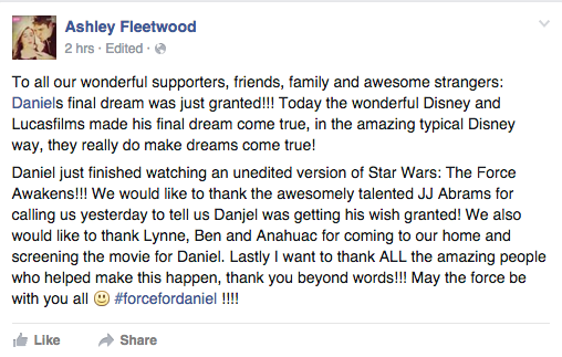 Così, Ashley ha postato un messaggio sulla sua bacheca di Facebook in cui esprime la sua gratitudine ad Abrams per avere inviato a Daniel una versione inedita del film. Scrive infatti: “L’ultimo sogno di Daniel è stato appena esaudito. Oggi la fantastica Disney e Lucasfilms hanno fatto sì che il suo sogno diventasse realtà, mantenendo fede al motto Disney ‘dove il sogno diventa realtà’.”