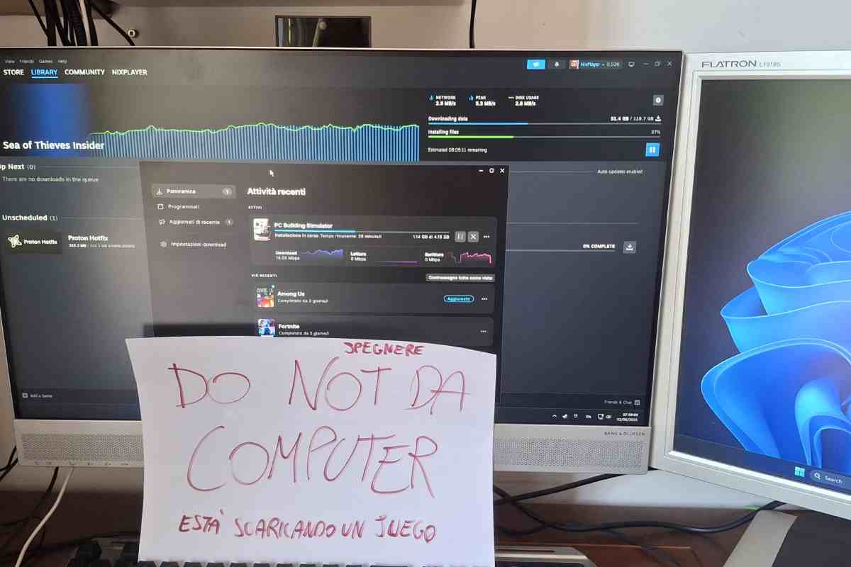 Su Reddit, in uno dei subforum dedicati a chi apprezza il PC, un utente italiano ha pubblicato una foto con un messaggio infilato dietro la prima fila dei tasti della tastiera e appoggiato sullo schermo in cui chiede espressamente a sua mamma, in italiano, inglese e spagnolo, di non spegnere il PC perché c’è un gioco che si sta scaricando.