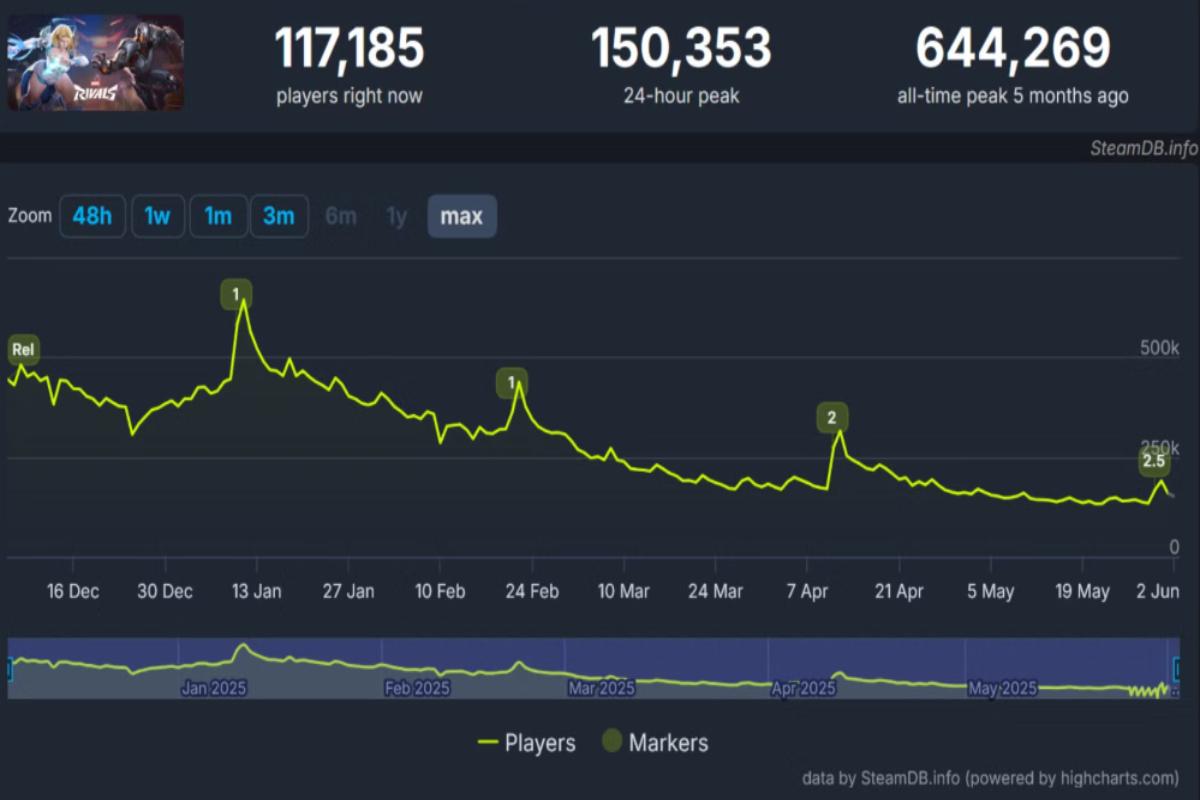 Per esempio, l’inizio della Stagione 1.5 ha visto un aumento di oltre 117.000 giocatori al lancio, mentre l’inizio della Stagione 2 ha visto il numero di giocatori di Marvel Rivals quasi raddoppiare, passando da 170.000 a 315.000. La crescita della stagione 2.5 è molto meno impressionante, con un aumento di poco meno di 60.000 unità.
