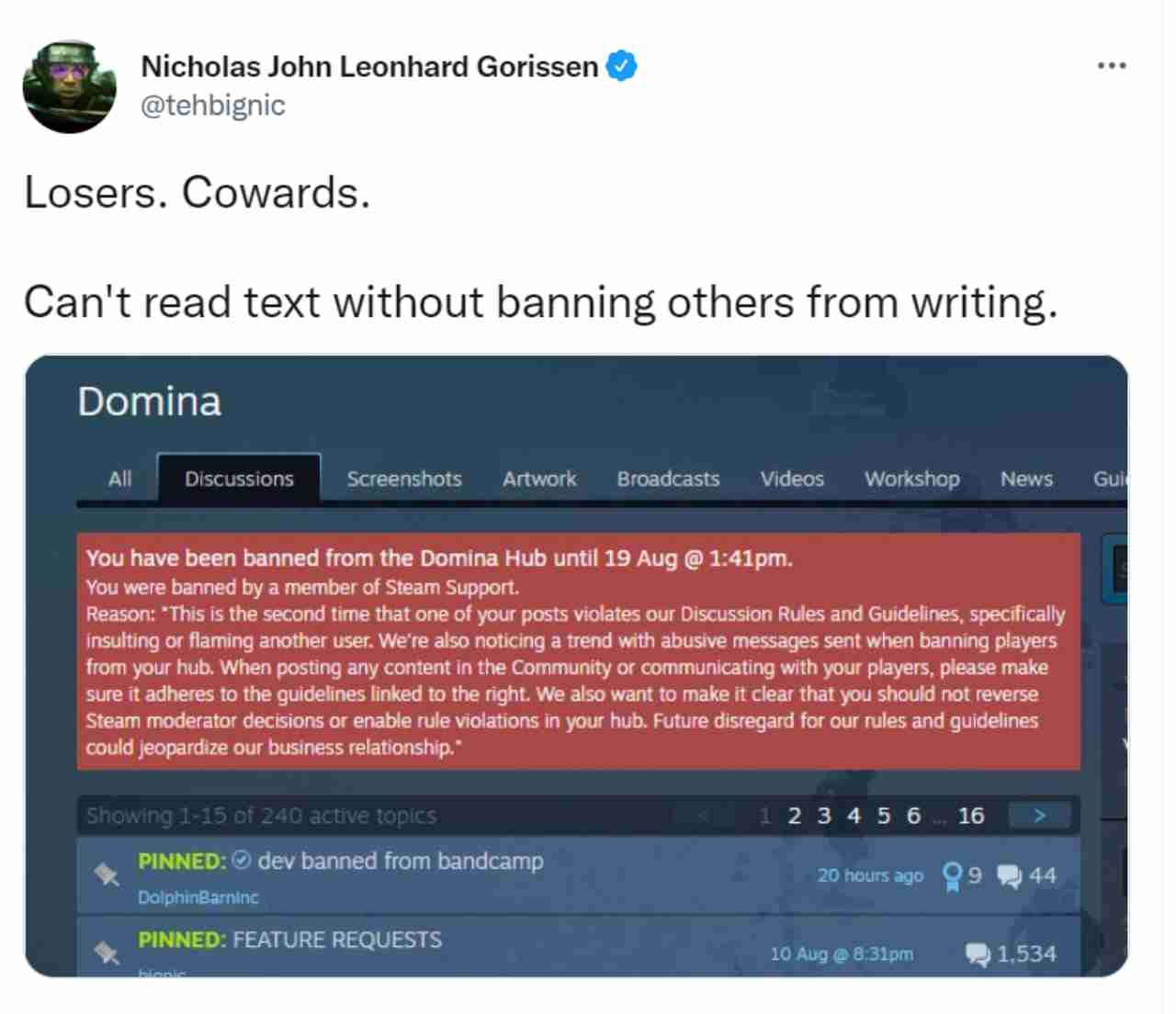 Il developer è noto fin da quando il suo gioco a base di gladiatori è uscito nel 2017 per non essere proprio il più gentile e accomodante dei developer. E meriterebbe un premio per la coerenza visto che dopo essere stato avvisato da Steam che uno dei suoi post, pieno di insulti gratuiti fatti a casaccio, era stato segnalato, ha continuato a usare un linguaggio sprezzante e offensivo. E si è beccato quindi un ban dai forum di Steam. Ma questo non lo ha fermato e in una sua personale crociata contro tutto il resto del mondo, composto secondo la sua logica di codardi, ha deciso di fare uno screenshot del ban e di aprire una discussione su Twitter.