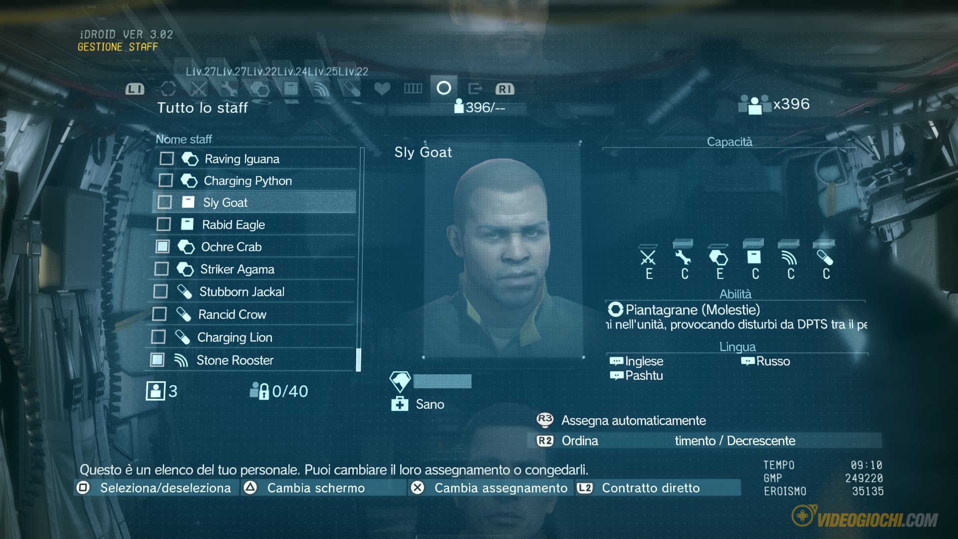 Tutto questo senza considerare l’enorme mondo attorno alla Mother Base, nella quale è possibile impiegare i soldati recuperati in missione tramite sistema Fulton assegnandoli a una delle sei (sette contando l’online) unità, ognuna con un ruolo fondamentale e il cui livello più alto si traduce in vantaggi maggiori, dalla possibilità di sviluppare armi e oggetti a quella di fornire rifornimenti e supporto aereo in missione.