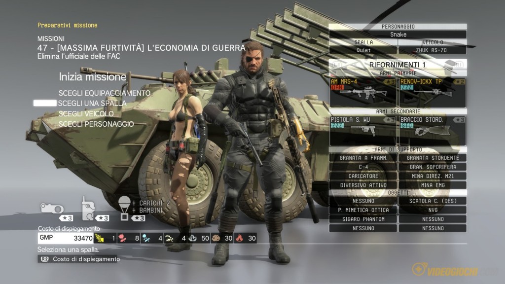 A fare da contorno ci sono le missioni opzionali, le cui prime sono praticamente essenziali per iniziare un minimo di sviluppo della Mother Base, mentre alcune di esse sono definite dal gioco “importanti“, ovvero incidono direttamente sulla trama e devono essere seguite per poter sbloccare le missioni seguenti.