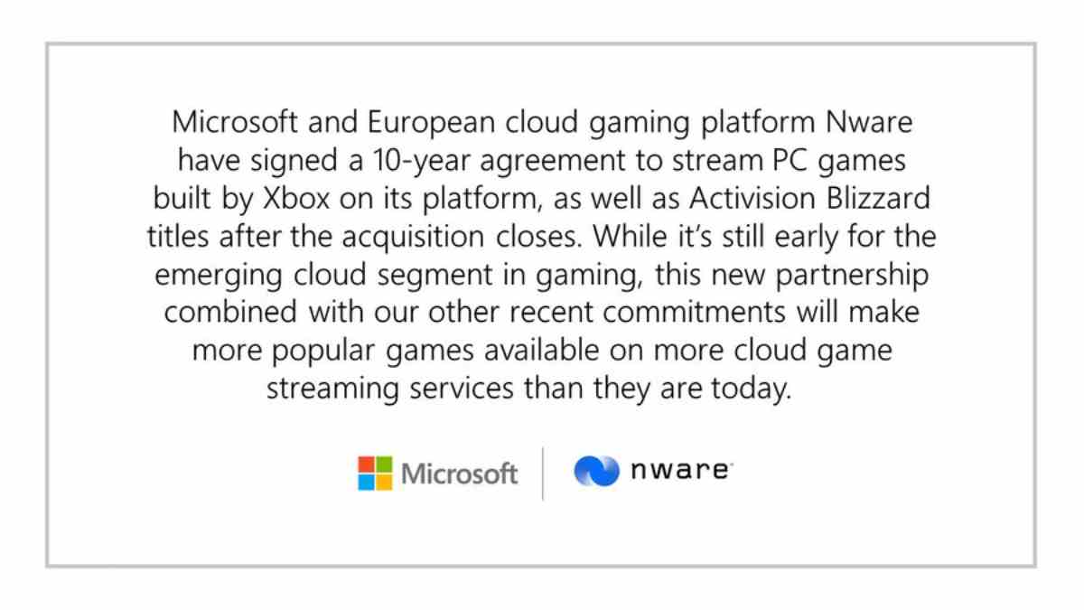 Prima che l’organo che valuta la concorrenza nel mercato britannico si esprimesse contro l’acquisizione, Microsoft aveva già pubblicato gli annunci di una serie di accordi decennali. C’era stato per esempio quello con Boosteroid, c’era stato quello con Nvidia e c’era stato quello con Nintendo. Tutti questi accordi sembravano messi in difficoltà dalla decisione della CMA di bloccare l’accordo ma Microsoft ha deciso di continuare sulla stessa linea e Brad Smith ha annunciato un altro accordo decennale stavolta con gli spagnoli di NWARE.