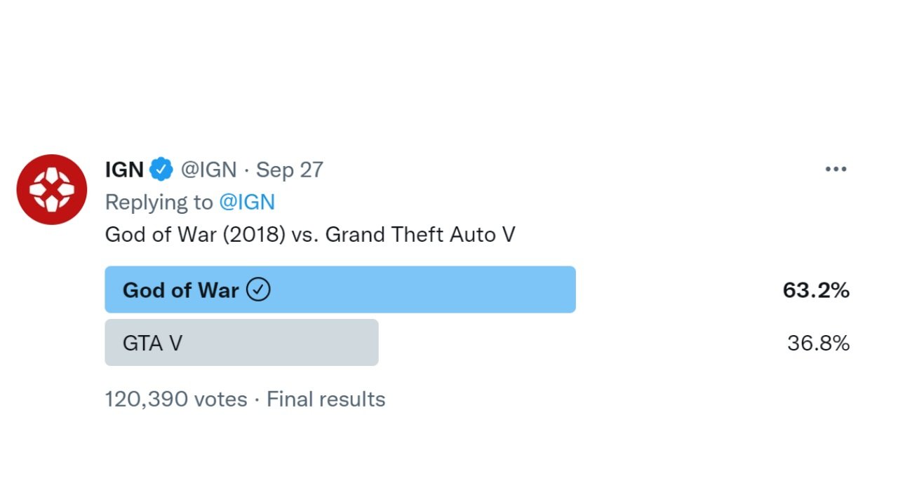 E sempre con una vittoria del 61% Kratos ha fatto un occhio nero anche a Geralt che scendeva in campo con The Witcher 3: Wild Hunt. Nella semifinale God of War ha superato sempre con il 61% di preferenze Grand Theft Auto San Andreas scontrandosi poi nella finale con Grand Theft Auto V. GTA V era arrivato invece in finale battendo Legend of Zelda Breath of the wild, Batman: Arkham City, Halo e Uncharted 2.