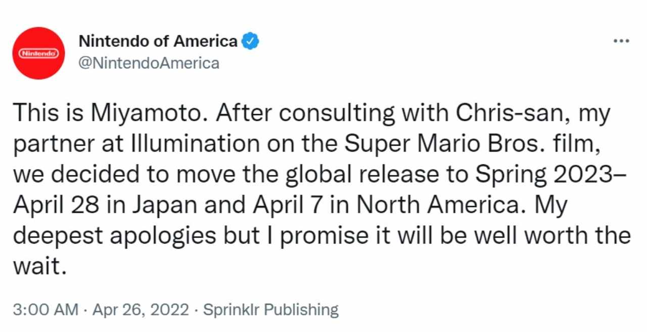 In realtà il messaggio pubblicato sull’account Nintendo of America e firmato Shigeru Miyamoto non dà grandi spiegazioni: “Miyamoto qui. Dopo esserci consultati con Chris-san, mio partner per il film di Super Mario Bros presso Illumination, abbiamo deciso di spostare l’uscita globale alla primavera del 2023: il 28 aprile in Giappone e il 7 aprile in Nord America. Mi scuso profondamente ma vi prometto che ne varrà la pena“. Chirs-san è Chris Meledandri, CEO di Illumination, che a sua volta ha preso possesso per un momento dell’account Twitter di Illumination per dire praticamente la stessa cosa.