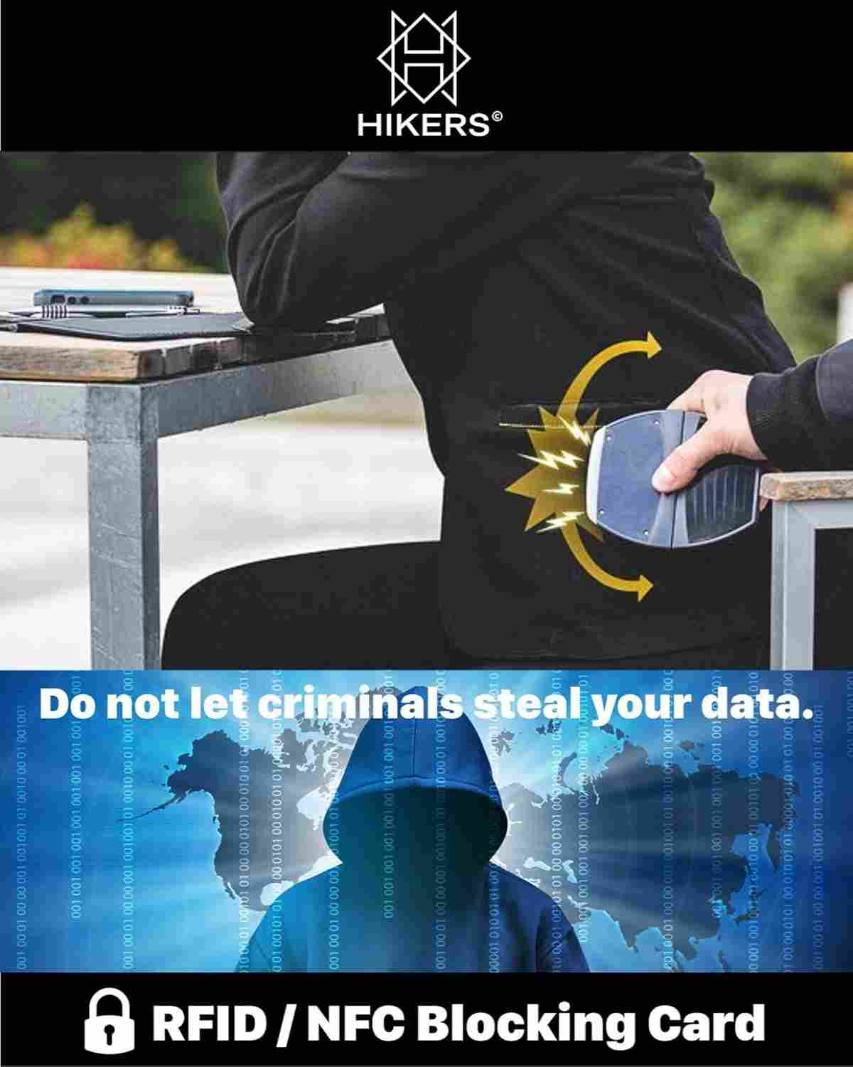 Ad esempio usando la carta di blocco Hikers, che si mette nel portafoglio come una classica carta di credito e scompare elegantemente, offuscando i segnali degli scanner utilizzati dai pirati informatici, dai criminali e dagli hacker di ogni tipo.