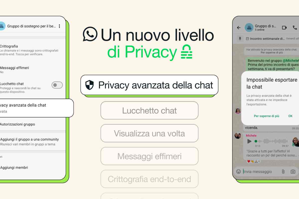 È stato infatti introdotto un nuovo livello di privacy: la privacy avanzata. La funzione è disponibile sia nelle chat private sia nei gruppi e blocca totalmente l’esportazione dei contenuti.